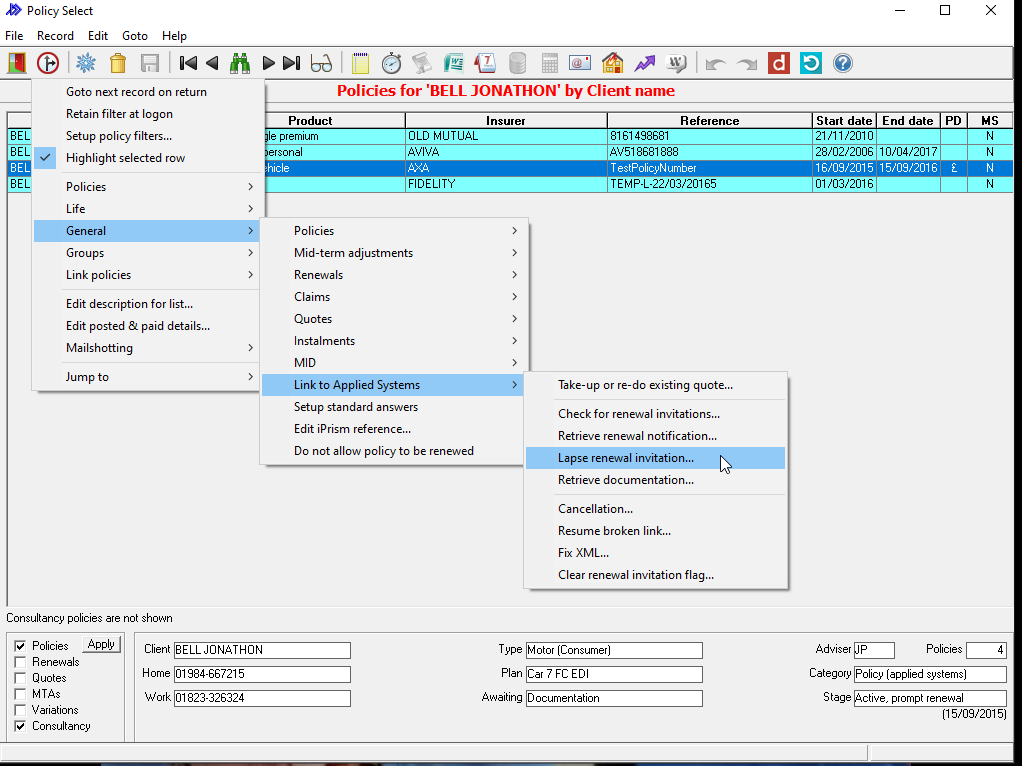 You can instruct Durell to communicate with Applied Systems, in order to check for any renewal invites that may be missing. Start by going to the policy list for the client in question. Then, ensure all policy row types are being displayed by ticking ...